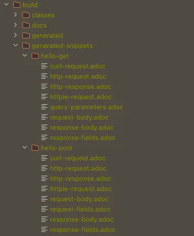 테스트 성공 시 build/generated-snippets/hello 경로에 .adoc 스니펫 파일이 생성된다. 이후 Asciidoctor Task 통해 HTML 문서로 변환할 수 있다.