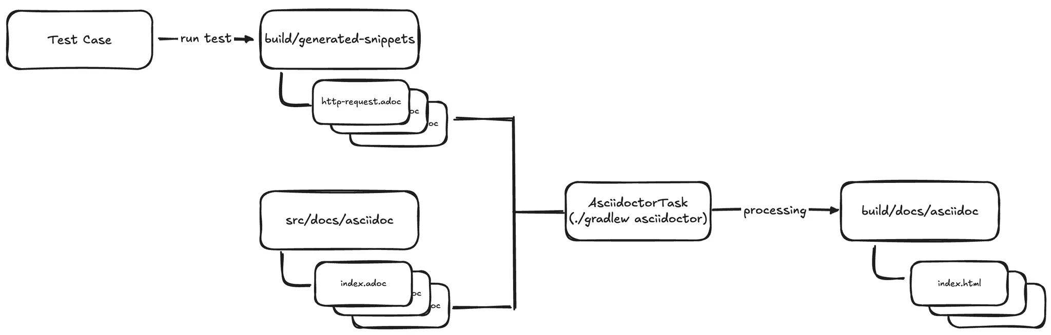 src/docs/asciidoc경로에 위/build/generate-snippets/*.adoc파일들을include해서AsciiDoc 스타일로 문서 작성./gradlew asciidoctor명령어로 Asciidoctor Task를 실행하면 adoc 파일들을 엮어서 html 문서를 생성